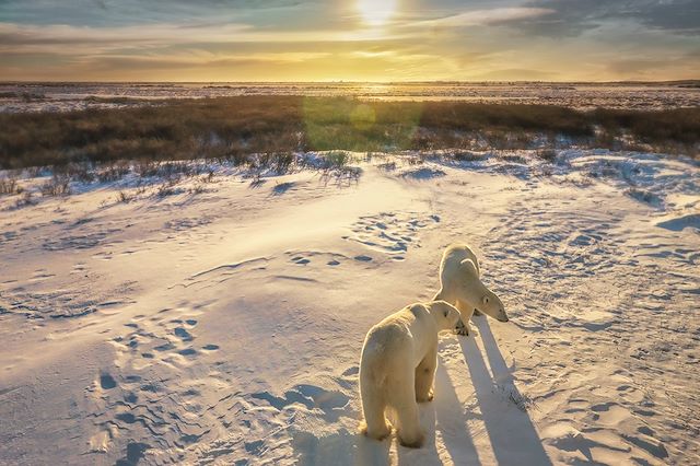 C'est sur la fin de l'automne quand l'hiver s'annonce et que la banquise revient que les ours polaires se rapprochent de la petite ville de Churchill. Ils attendent la formation de la banquise qui va leur permettre de rejoindre leur territoire de chasse. Environ 300 ours stationnent sur les 50 km de côtes entre le cap et le village. Ce site est le seul endroit au monde permettant d’observer le "roi de l’Arctique" dans des conditions optimales. Ce début d’hiver nous offre également la vision du renard polaire, des compagnies de lagopèdes et la chouette harfang. C’est un séjour unique, durant lequel nous partons deux jours dans la toundra, en véhicule 4x4 surélevé, pour observer les ours polaires et découvrir les environs de Churchill et son histoire. En dehors des journées d’observation dans la toundra, nous avons l’opportunité de sillonner les environs en minibus, faire une initiation en traîneau, visiter la prison à ours et apprendre l’histoire des trappeurs et la vie de la baie d’Hudson.