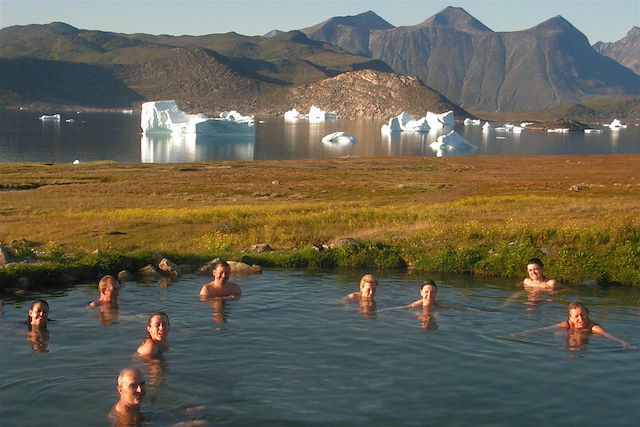 Transfert en bateau vers l'île d'Uunartoq. Temps libre pour profiter d'un bain relaxant dans les sources chaudes d'Uunartoq (les seules sources thermales accessibles du Groenland), un lieu de villégiature pour de nombreux autochtones qui viennent de tout le pays pour camper et se baigner dans les sources thermales, tandis que des icebergs flottent à seulement 500 mètres. Puis, nous poursuivrons notre navigation pour rejoindre Qaqortoq.