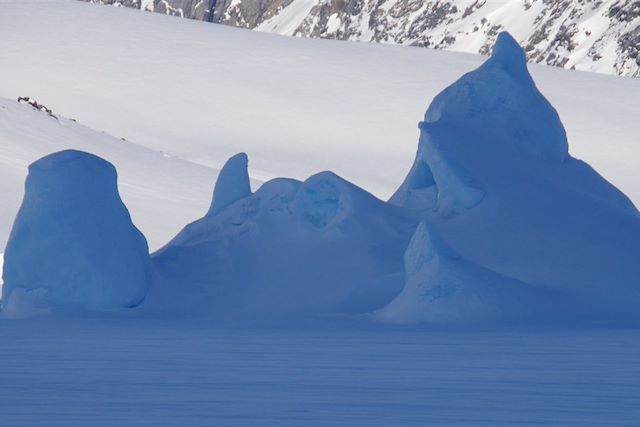 Si le temps est dégagé, possibilité d'observer des aurores boréales. Nous quittons ce premier bivouac pour rejoindre Torssukatak, une petite baie étroite coincée entre 2 montagnes. Laissant la banquise pour quelques heures, nous passons un tout petit col qui nous mènera de l'autre côté de l'île. Retour sur la banquise, nous observons le chaos des glaces côtières liées à la marée Les plaques de glace se cassent et se chevauchent entre elles. Nous établissons notre deuxième bivouac sur la rive nord de l'île.