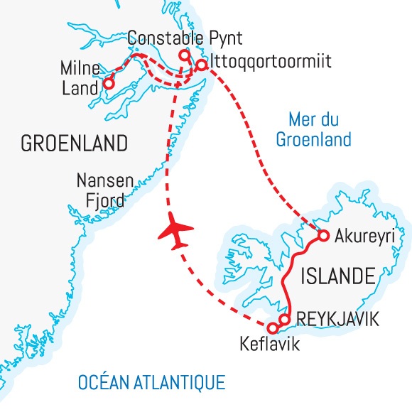 Cette croisière au Groenland vous conduit sur les traces de l'explorateur polaire Jean-Baptiste Charcot, qui cartographia la région en 1932. Fjords, sommets culminant à 2000m, glaciers, icebergs, blocs de glace composent le plus extraordinaire des tableaux vivants. Par petites touches, l’automne a ajouté ses chaudes couleurs rouge cramoisi et acajou qui rappellent celles des montagnes environnantes. C'est aussi la saison des aurores boréales qui, le soir venu, vous offriront peut-être un magnifique ballet. Le Scoresby Sund réserve bien des surprises. Ainsi certains icebergs font plus de 100 mètres de haut et 1 kilomètre de long. Chaque jour, des randonnées sont prévues pour partir à la rencontre des peuples d’hier et d'aujourd’hui, civilisation de Thulé et habitants d’Ittoqqortoormiit.
