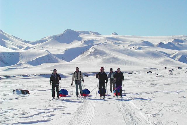 Ce raid à ski, bien qu’en Islande, relève d’une véritable expédition. Traversée sur calotte glaciaire. Autonomie complète. Tout le matériel, y compris la nourriture, est transporté dans une pulka. À tracter soi-même. Ce type d’itinérance demande une préparation sérieuse. Condition physique irréprochable. Solide mental. Capacité à affronter l’imprévu. L’engagement est total. L’esprit d’équipe est essentiel. Participation active aux tâches communes : montage des tentes, préparation des repas, gestion du camp. Chaque geste compte. Chaque membre est impliqué.
