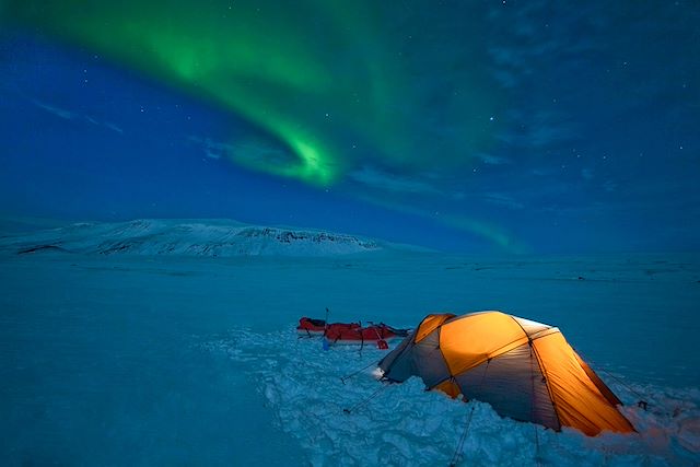 Arrivée prévue en début d’après-midi, si les conditions le permettent. Installation rapide. Préparation du matériel de progression : skis nordiques, fixations, peaux, pulkas. Brief technique. Premiers kilomètres sur pente douce. Prise en main du rythme. Ajustement des gestes. On entre dans l’expédition. Montage du bivouac sur neige compactée. Ancrage des tentes, vérification des haubans, creusement de tranchées coupe-vent. Première nuit sur glacier. Si le ciel s’ouvre, les aurores boréales pourraient danser au-dessus du camp.