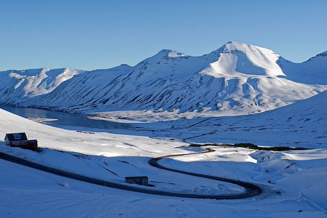 Le guide accueille le groupe. Brief rapide, puis départ en minibus. Reykjavík s’efface derrière les vitres, la route n°1 s’étire vers le nord. L’asphalte fend les terres volcaniques, les reliefs s’élèvent, sombres et puissants. L’ouest défile, puis vient le col : bascule vers un autre monde. Le nord s’ouvre, vaste et lumineux. Vallées larges, lumière rasante, villages isolés accrochés à la roche. Haltes furtives pour goûter l’air, marcher, sentir la terre. En fin de journée, Ólafsfjörður apparaît, chalets posés face au fjord, immobiles. Installation. Dalvik se dévoile, village discret tourné vers la mer, ancré dans la pierre. Soirée calme, chaleur du bois, confort simple. Nuit au grand nord islandais, silence profond.