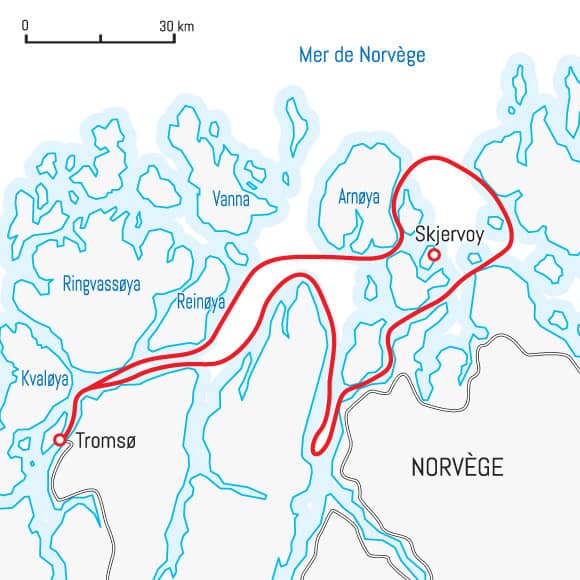 Petit déjeuner conséquent, puis débarquement sur le lieu de ski ( Nous vous proposons des barres céréale et autres à emporter pour la sortie). La course se fait soit en aller/retour, soit en traversée et nous vous récupérons dans le fjord d'à côté. A votre retour une soupe et des tapas sont proposées pour le déjeuner, navigation sous voile si possible pour nous rendre sur le prochain lieu de ski. Le soir, apéro et un repas élaboré et avec un peu de chance l'occasion d'observer des aurores boréales...