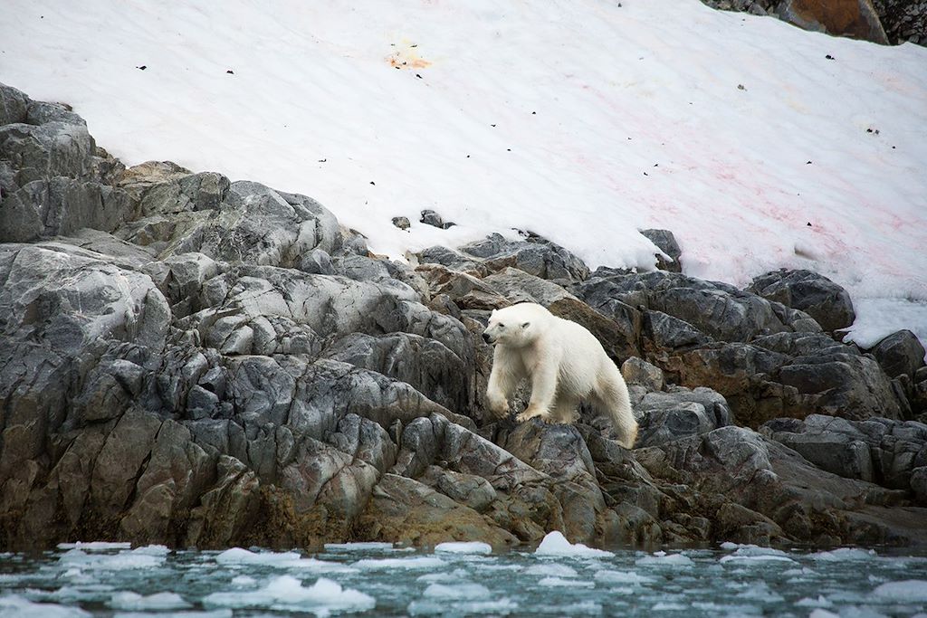 L’ours a pour territoire la glace mouvante mais on le rencontre souvent sur la terre ferme en hiver. Nous aurons sans doute la chance de le croiser sur la côte Est et les îles du Spitzberg. "Kong Karls Land" est la zone la plus connue où une réserve naturelle a été créée dès 1939. La chasse fut réglementée en 1970 puis totalement interdite en 1976. Il y a de nombreux ours blancs sur tout l’archipel mais surtout le long des côtes orientales et septentrionales. L’ours est un animal curieux attiré par la nourriture. Un ours affamé peut être agressif et dangereux pour les êtres humains. Soyez donc circonspects lors de vos randonnées pédestres et une arme est obligatoire. Le gouverneur doit être prévenu aussi tôt que possible lorsqu’un ours a été abattu. La peau et la carcasse appartiennent alors à l’Etat norvégien.