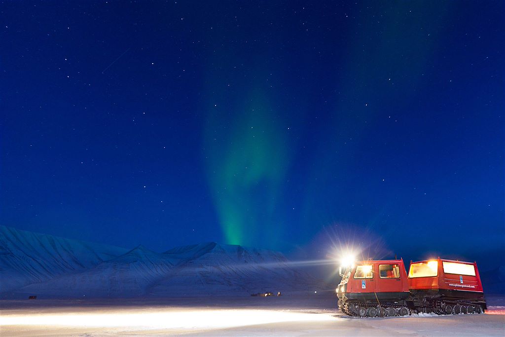 Le 14 novembre à Longyearbyen, le soleil passe sous l'horizon et ne réapparaîtra que le 29 janvier suivant. Un phénomène unique qui plonge alors le Spitzberg dans la nuit polaire. Une ambiance unique d'un bleu glacial, mais réchauffé par la lumière de la lune qui se reflète dans la neige et par le ballet des aurores boréales. Longyearbyen, devient un lieu magique, hors du temps, uniquement éclairé par les réverbères. Vous partez à la découverte de ce milieu en snowcat (chenillette polaire), motoneige, traîneau à chiens, et au cœur d'une fantastique grotte de glace sculptée en été par les eaux de fonte des glaciers. Une aventure vraiment unique.